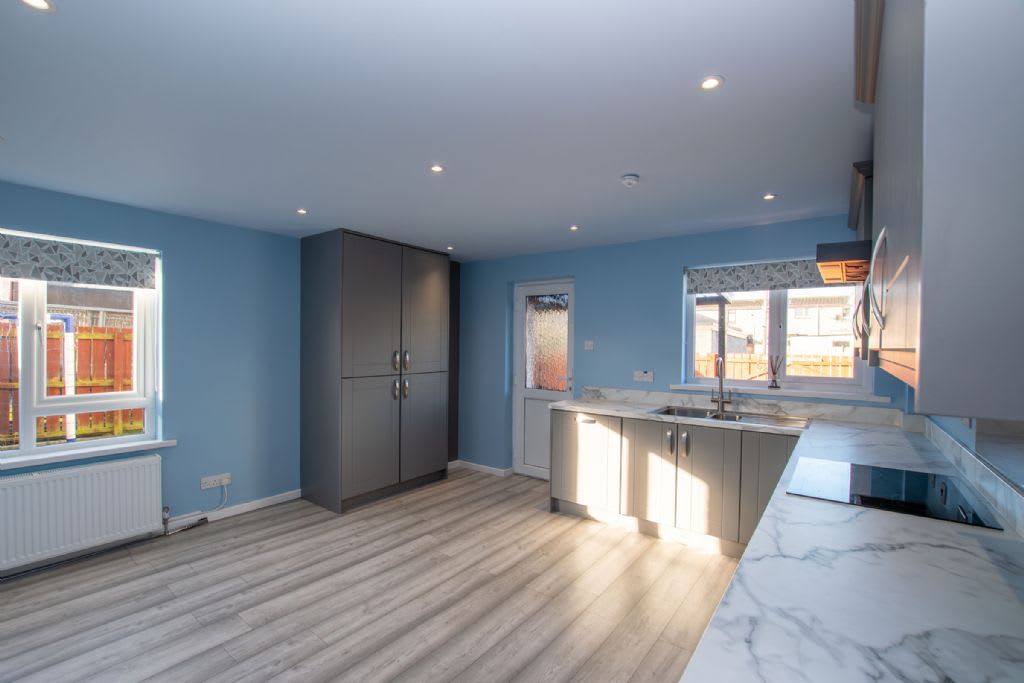 The ground floor benefits from a spacious living-room with open fire and a modern kitchen & dining area with built in oven, hob and dishwasher.